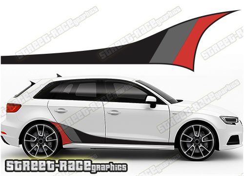 Audi A3 lower side racing stripe digitally printed graphics. There are no gaps or clear areas in these graphics, so they can be fitted to any colour car.