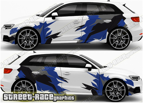 This is a 3 colour Audi A3 rally graphics kit, shown in black, dark blue & dark grey. Gaps in the design are clear so the cars background colour shows through.
