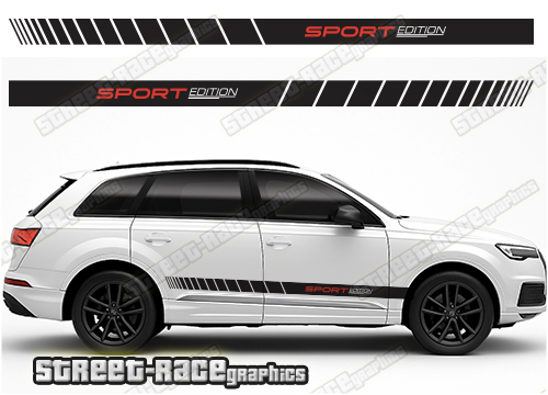 Audi Q7 racing stripes. They are shown on the 2020 Audi Q7. The decals are universal fit: they are not pre-cut for any specific Q7 so they will be suitable for any facelift variants. They do not have any wheel arch cutouts or door line splits. These will require trimming during fitting.