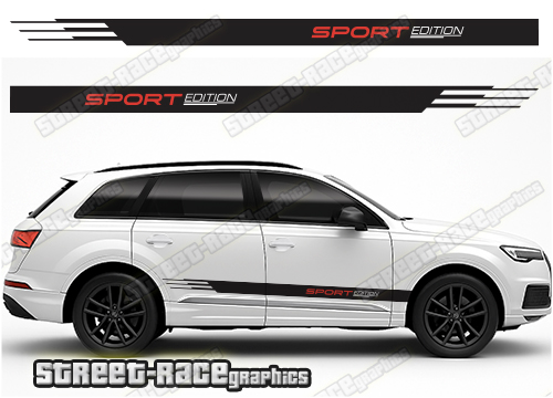 Audi Q7 racing stripes. They are shown on the 2020 Audi Q7. The decals are universal fit: they are not pre-cut for any specific Q7 so they will be suitable for any facelift variants. They do not have any wheel arch cutouts or door line splits. These will require trimming during fitting.