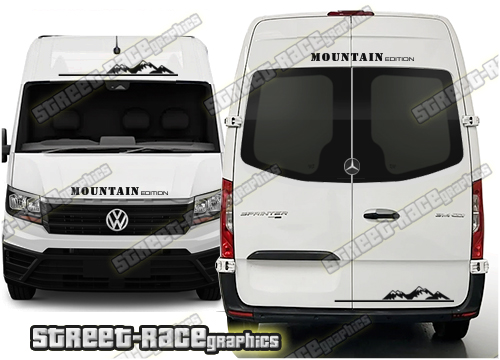 Campervan / Motorhome graphics kits. These are ideal for giving your existing camper a new look or to finish off a new camper conversion project. They are sized to fit the Mercedes Sprinter and VW Crafter (all years and variants).