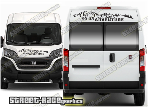 Campervan / Motorhome ‘ON AN ADVENTURE’ graphics kits. These are ideal for giving your existing camper a new look or to finish off a new camper conversion project. They are sized to fit the Peugeot Boxer, Citroen Relay and the Fiat Ducato. These complement the graphics listed in the ‘side graphics’ category.