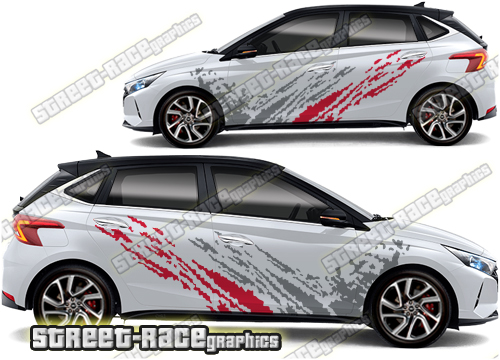 Hyundai i20 large graphics. They are a universal fit to suit all Hyundai i20 cars and facelift variants. There are no cutouts for the door handles, wheel arches or door lines; these will require trimming during fitting.
