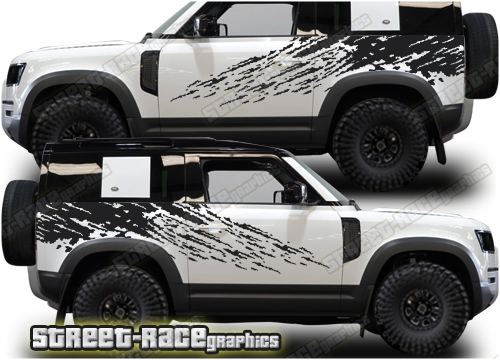 Land Rover Defender 90 graphics. They are shown on the 2020 Defender (L663). The decals are universal fit: they are not pre-cut for any specific Defender 90 L663. They do not have any door handle cutouts, wheel arch or door line splits. These will require trimming during fitting.