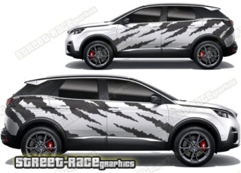 Peugeot 3008 graphics. They are shown on the first generation 3008 but they can be trimmed to fit all later versions and facelift variants. The decals are not pre-cut for any specific Peugeot 3008 version; they do not have any door handle cutouts, wheel arch or door line splits. These will require trimming during fitting. Vinyl will not stick to unpainted textured plastics.