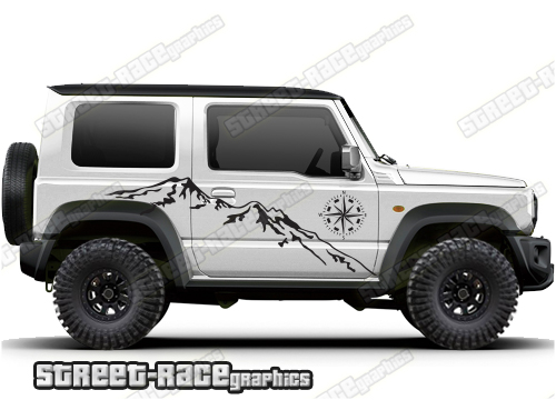 Suzuki Jimny graphics. They are shown on the fourth generation Suzuki Jimny but they can be trimmed to fit the MK2 and MK3. The decals are not pre-cut for any specific Jimny version; they do not have any cut-outs for the door handles, wheel arches or door line splits. These will require trimming during fitting.