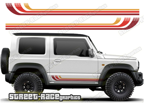 Suzuki Jimny racing stripes. They are shown on the fourth generation Suzuki Jimny but they can be trimmed to fit the MK2 and MK3. The decals are not pre-cut for any specific Jimny version; they do not have any cut-outs for the wheel arches or door line splits. These will require trimming during fitting.