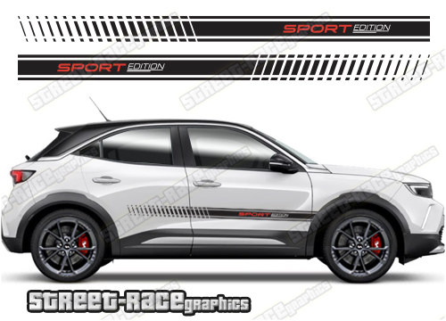 Vauxhall Mokka racing stripes. They are shown on the first generation Mokka but they can be trimmed to fit all later versions and facelift variants. The decals are not pre-cut for any specific Vauxhall Mokka version; they do not have any door handle cutouts, wheel arch or door line splits. These will require trimming during fitting. Vinyl will not stick to unpainted textured plastics.