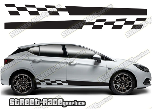 Vauxhall / Opel Astra racing stripes. They are a universal fit to suit all Vauxhall / Opel Astra cars and facelift variants. There are no cutouts for the wheel arches or door lines; these will require trimming during fitting.