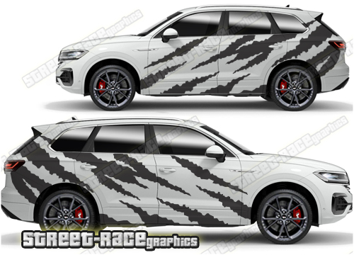 Volkswagen Touareg graphics. They are shown on the first generation Touareg but they can be trimmed to fit all later versions and facelift variants. The decals are not pre-cut for any specific Volkswagen Touareg version; they do not have any door handle cutouts, wheel arch or door line splits. These will require trimming during fitting. Vinyl will not stick to unpainted textured plastics.